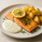 Saftig ugnsbakad lax med citron och dill, serverad med en enkel krämig sås. Perfekt till potatis, ris eller en fräsch sallad.